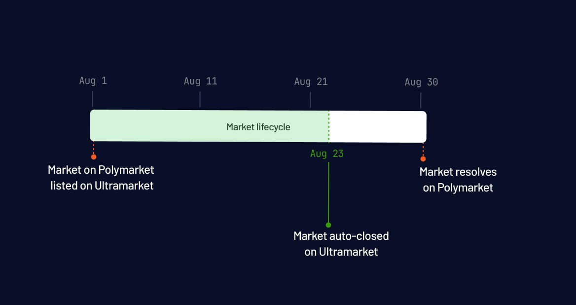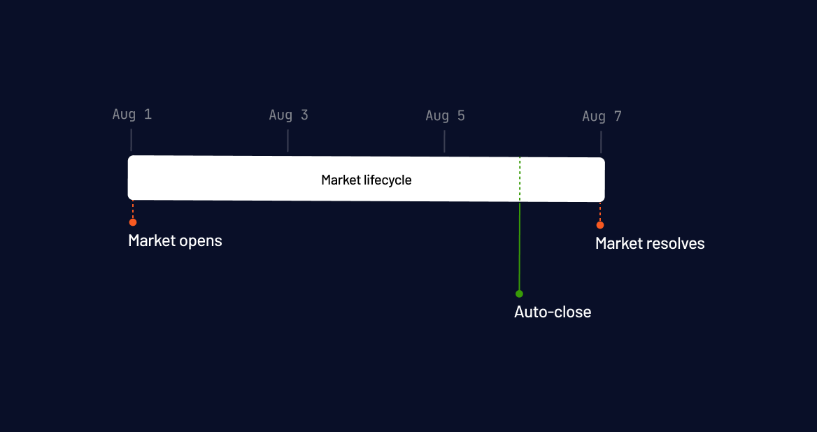 For binary markets (yes/no, one outcome), a single auto-close timestamp is all you need. There's one dangerous moment called resolution, and you just need to be gone before it arrives.