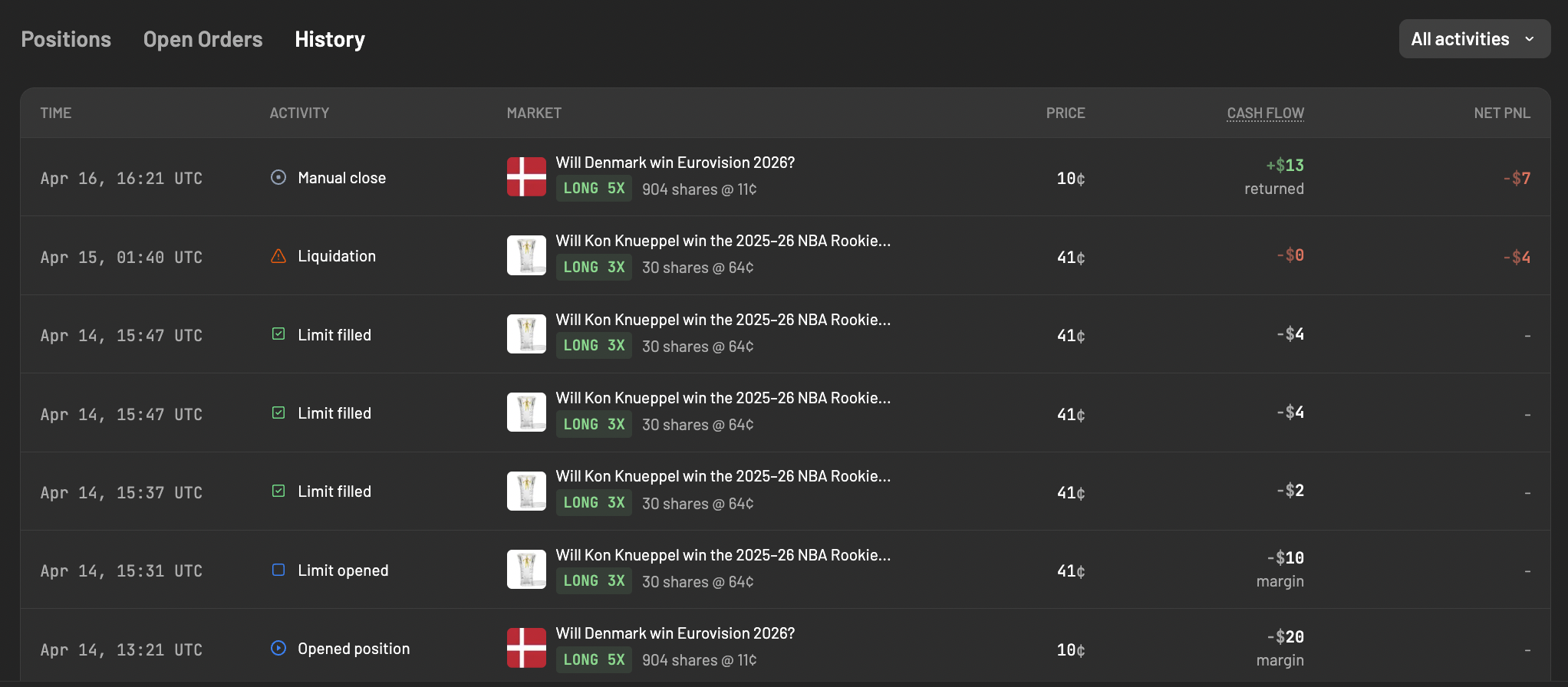 The History tab now shows a full breakdown of every transaction type: market opens, market closes, limit order fills, limit order expirations, cancellations, deposits, rewards, and fee settlements. Each entry is categorized and timestamped. If you placed a limit order that partially filled, expired, and returned capital, every step shows up as a distinct line item.