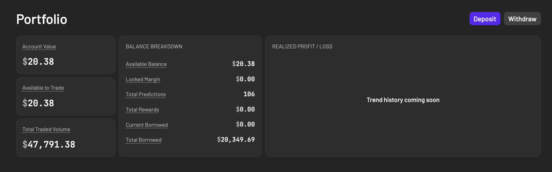 Provide a caption (optional)The Portfolio page now shows a detailed balance breakdown at a glance: available balance, locked margin, total predictions, total rewards, current borrowed, and total borrowed. Everything that makes up your account value is surfaced in one view, no digging required.