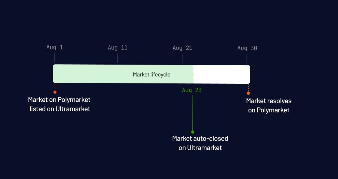 Every position on Ultramarkets auto-closes days or even weeks before the underlying event resolves. We currently close our markets 7–10 days before the corresponding Polymarket expiration. A Fed rate decision market on Polymarket might resolve after the April 28–29 FOMC meeting. On Ultramarkets, we're out by early April. An EPL season winner market might resolve in May on Polymarket. We're out by late March.