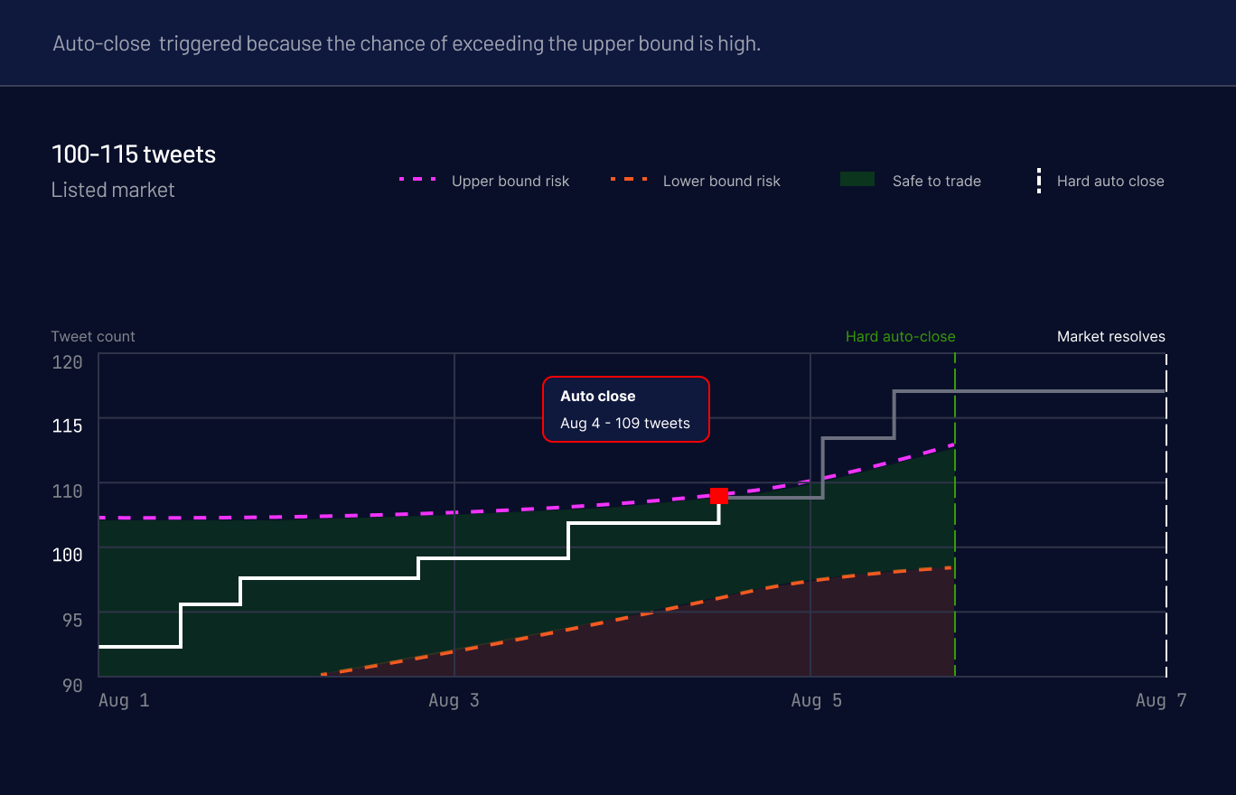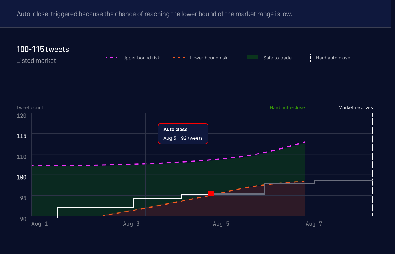 This is the biggest update we've shipped last week. Our current approach when determining the auto-close date for markets is currently static hence unable to support dynamic range markets such as Elon tweet count markets that depended on Elon’s live tweet data. Once Elon’s Tweet Count market is listed on Ultramarkets this coming week, each range market will be auto-closed independently through a three-layer protection system we built from scratch.